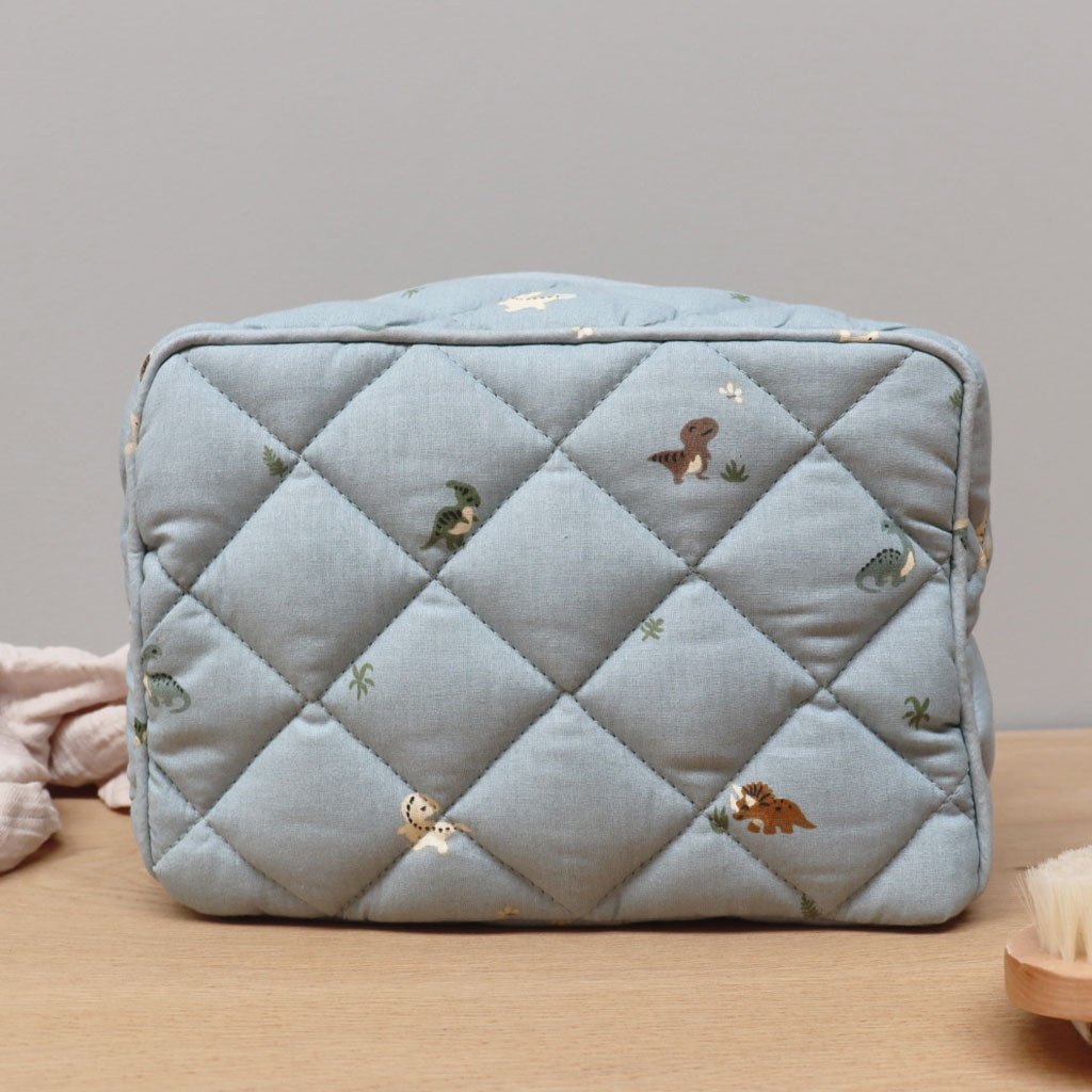 Gemaakt van 100% katoen en Oeko-Tex gecertificeerd, dus veilig, stevig en zacht in gebruik. Het vrolijke Dino-design in blauw met gouden accenten maakt deze toilettas extra leuk.