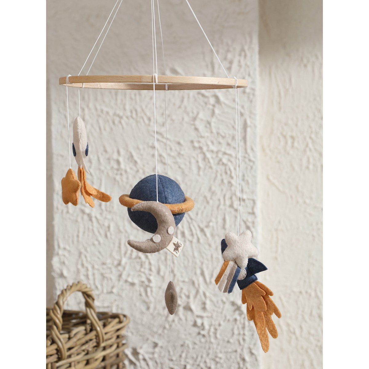 Deze betoverende Space Babymobiel brengt het heelal naar de kinderkamer. Met een handgemaakte Saturnus, maan, twee raketten, twee sterren en twee kometen, straalt dit mobiel avontuur en verwondering uit. De zachte kleuren en speelse vormen creëren een rustgevende én inspirerende sfeer voor je kleintje.